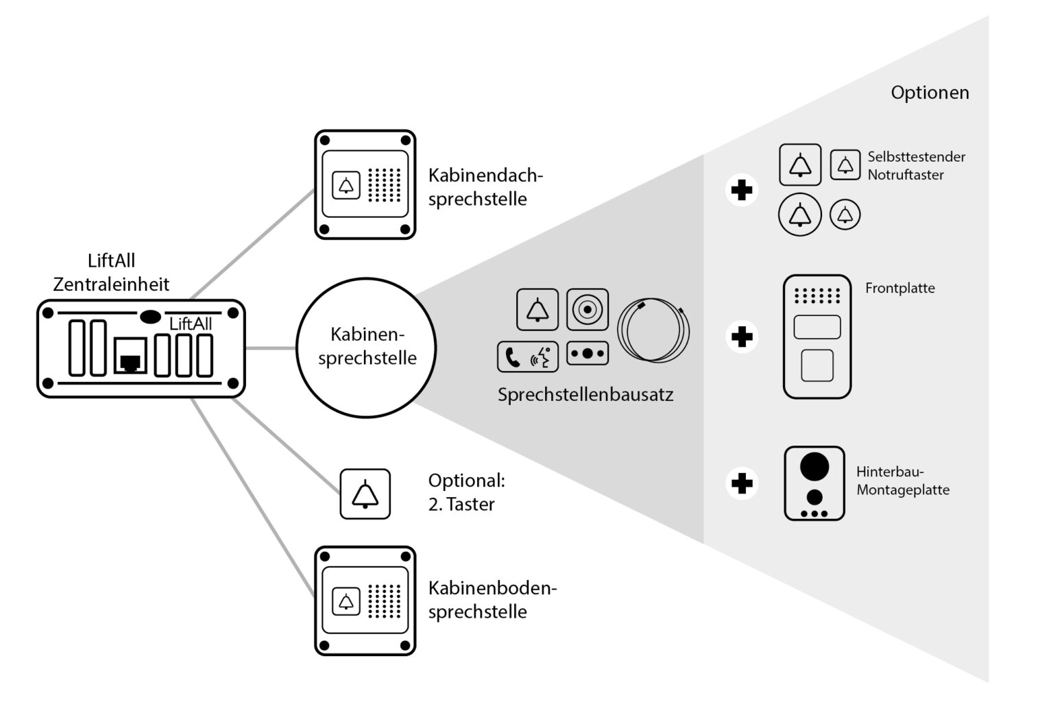 - Minimale Infrastruktur: eine LiftAll-Zentraleinheit steuert bis zu 3 Sprechstellen –