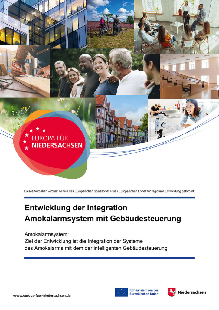 Wir sind stolz darauf, dass unser aktuelles Projekt „Entwicklung der Integration Amokalarmsystem mit Gebäudesteuerung“ Teil des Programms „Europa für Niedersachsen“ ist und mit Mitteln des Europäischen Sozialfonds Plus/Europäischen Fonds für regionale Entwicklung gefördert wird.